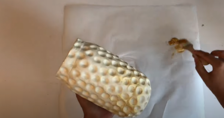 Далее можно придать поверхности будущей вазы какую-либо фактуру или сделать на ней объемный рисунок. В нашем случае для этого был использован небольшой шарик — его ряд за рядом отпечатали на всей поверхности заготовки. Когда все готово, оставляем нашу вазу до полного высыхания массы.