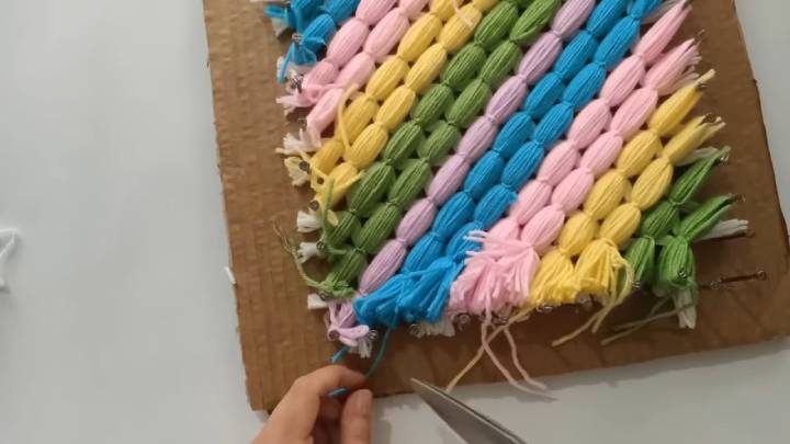 Когда свяжете все слои вместе (каждый цветной слой соединяется с белым пряжей цветного слоя), ножницами обрежьте пряжу между гвоздей и на самих гвоздях.