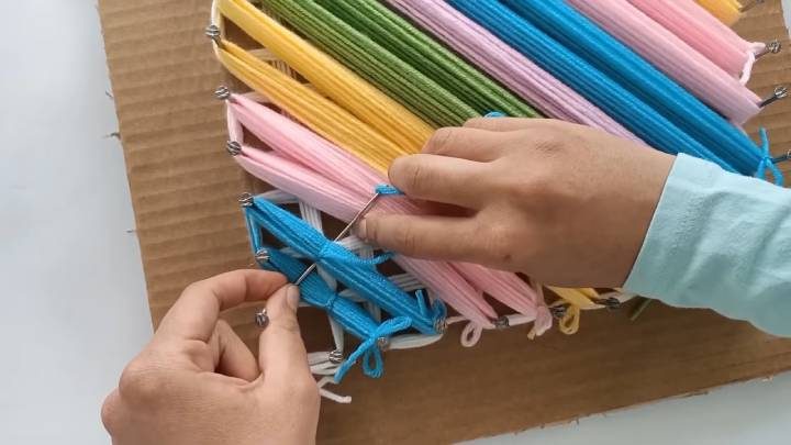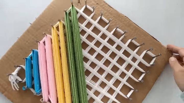 Сделайте такой же второй ряд, чтобы готовая вещь была толще. Теперь возьмите цветную пряжу любого цвета, всего одну нить, привяжите к третьему гвоздю в нижнем ряду и переплетайте 20 раз к параллельному гвоздю. Затем, после 20 обмоток, перейдите на гвоздь выше в левом ряду и сделайте ещё 20 переплетений между параллельными друг другу гвоздями. Завяжите пряжу вокруг гвоздя снизу.