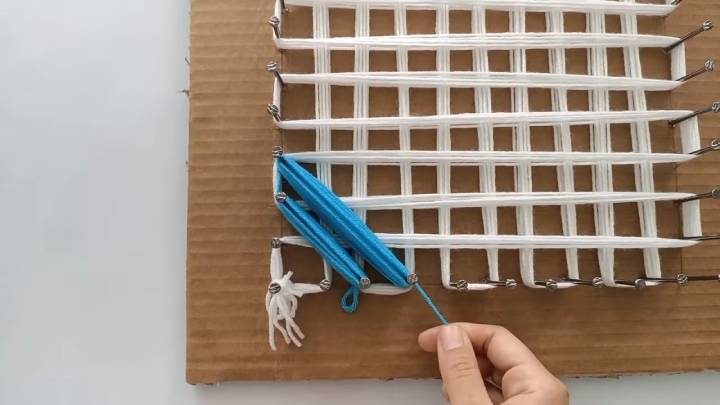 Возьмите гофрокартон. Отметьте на нём квадрат со сторонами 25 см. Данная цифра условна, так как вы можете сделать больший и меньший размер. Приклейте его к ещё одному картону, чтобы утолстить. На расстоянии 2,5 см друг от друга вставьте гвозди по всему периметру квадрата. Возьмите 4 нити белой пряжи (или меньше, если пряжа толстая), привяжите к угловому крайнему гвоздю снизу слева. Затем переплетайте пряжу, как показано на фото ниже, через 2 гвоздя, затем — вверх, снова — 2 гвоздя, вниз и т. д.