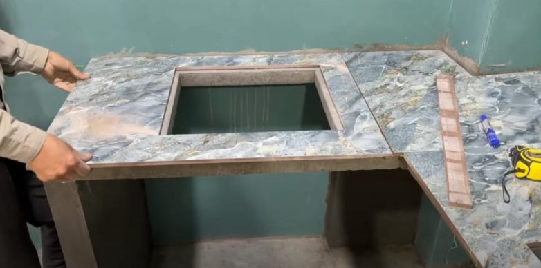 Теперь можно приступать к облицовке столешницы. Сначала отрезаем куски плитки и примеряем по месту. Потом вырезаем в ней отверстия под варочную панель и мойку. Укладываем керамогранит на раствор или клей.