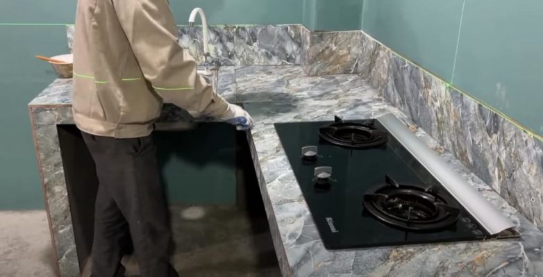Из того же керамогранита делам кухонный фартук. Устанавливаем варочную электропанель и кухонную мойку.