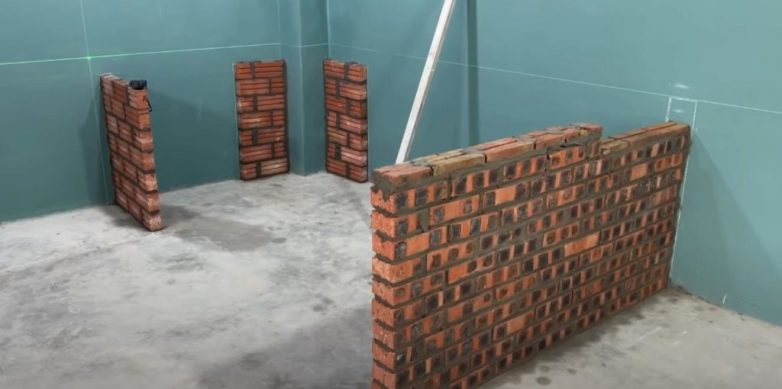 После этого возводим опоры из кирпича. Обычная кладка кирпича — ничего сложного. Но следить за вертикальностью мини-перегородок все же нужно.