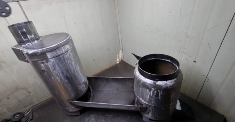 В нижней части маленького баллона, который выступает в качестве камеры горения, вырезаем часть металла и ввариваем кусок профильной трубы (зольник). На конце профтрубы, обрезанной под углом, крепится дверца.
