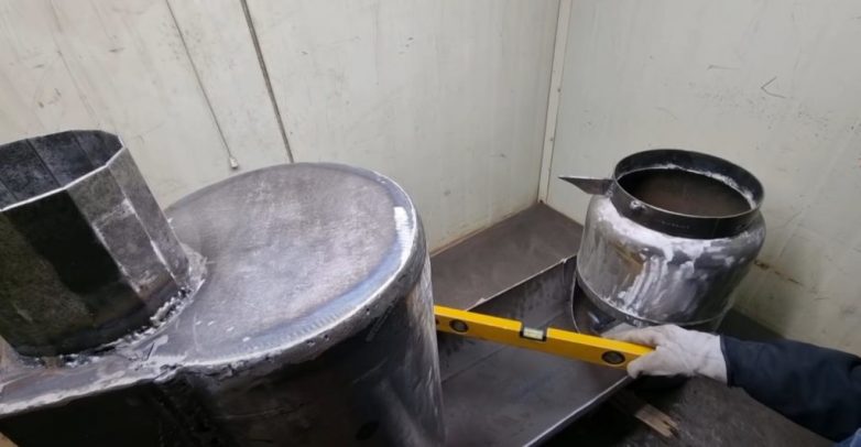 Далее соединяем обе части печи с помощью ранее вырезанного «корыта». Внутрь устанавливаем профильную трубу с отверстиями, конец которой выводим через квадратное окошко в маленьком баллоне. Привариваем к «корыту» варочную панель.