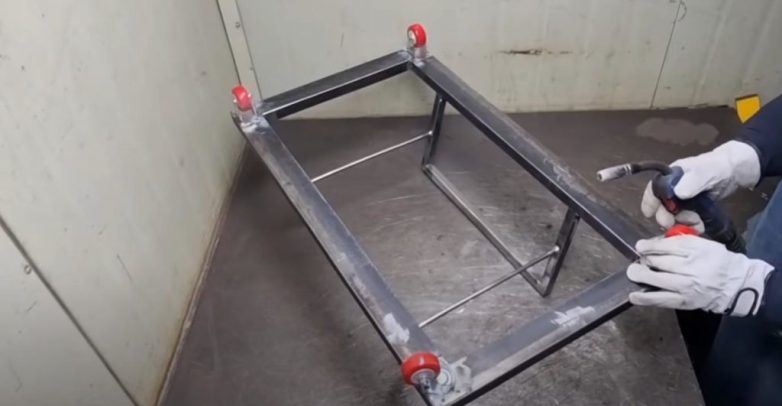 Теперь изготавливаем из профильной трубы опорную платформу. К нижней части привариваем четыре колесика.