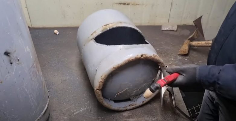 Потом в оставшихся двух баллонах объемом 50 л и 27 л вырезаем «окошки» в форме полукруга, чтобы можно было приварить «корыто», которое получилось из первого баллона.