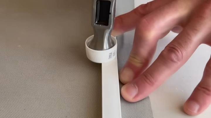 На молоток приклейте кусочек двустороннего скотча. К нему прилепите крышку от бутылки. Так молоток не повредит раму. Возьмите вторую половину кабель-канала и прибейте к раме.