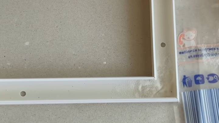 Ровно по центру рамы приклейте ещё один кабель-канал. Для этого канцелярским ножом немного отрежьте пластик по центру рамы по горизонтали (внутренний край), залейте клей и посыпьте содой сверху.