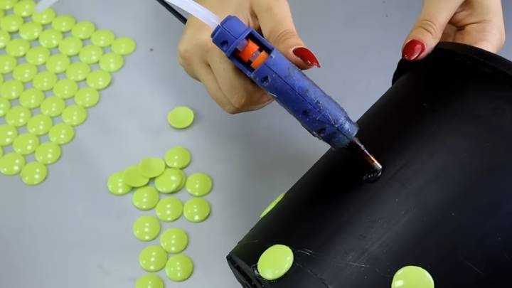 Обычное ведро и пластиковое покрасьте в желаемый цвет акриловой краской. На горячий клей приклейте декор.