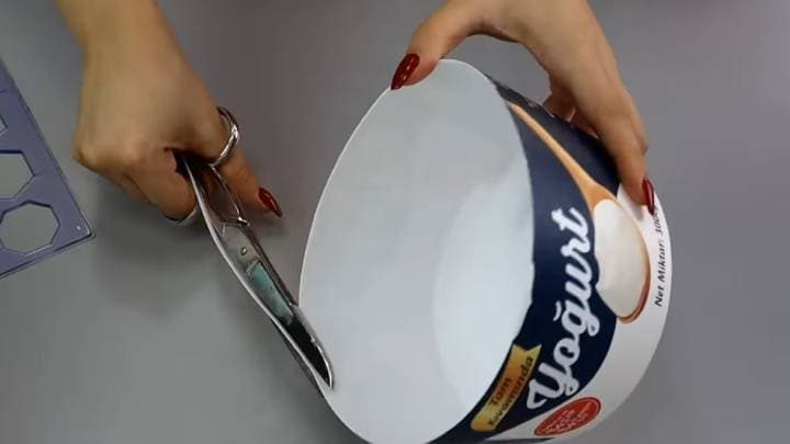 Возьмите пластиковое ведёрко и обрежьте у него верх с ободком. Также подготовьте любой декор, например, это может быть нескользящий коврик, который стоит копейки в таких магазинах, как ФиксПрайс. Разрежьте коврик на детали.
