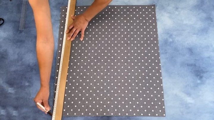 После этого сложите одну из деталей пополам. По центру от края самой узкой стороны отложите 13 см. Соедините получившуюся точку с углом скругляющейся линией и отрежьте по ней ткань.