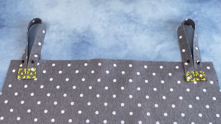 На двух самых тонких полосках ткани (7х40 см) отверните на изнанку и загладьте по всем сторонам по 1 см. После этого сложите вдоль пополам и вновь прогладьте утюгом. Проложите швы близко к краям. На большой детали без выреза отступите вниз 5 см и от бокового среза к центру 2,5 см. Ориентируясь на полученные метки, приколите и пристрочите получившиеся петли-ручки.