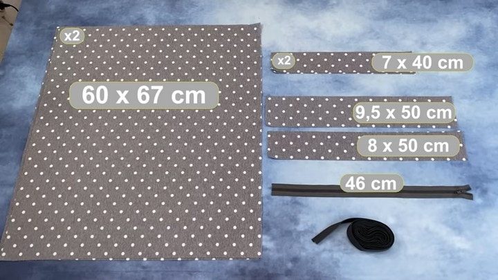 Вам понадобятся два прямоугольника ткани 60х67 см, для кармана один прямоугольник 21х33 см, две узкие полоски ткани 7х40 см, по одной полоске 9,5х50 см и 8х50 см, а также молния 46 см и косая бейка.