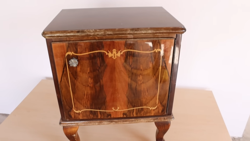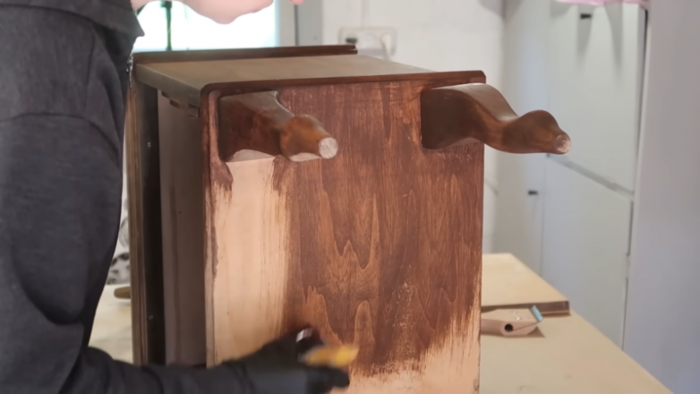 Обезжирьте все поверхности тумбы и покройте их слоем морилки. После высыхания морилки покройте поверхность составом с содержанием воска.