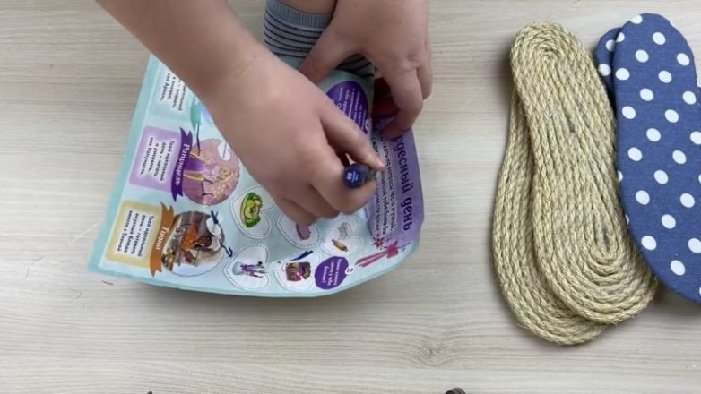 Плёнку приколите на пенопласт с помощью булавок. Возьмите горячий клей и приклейте по контуру подошвы шнур.