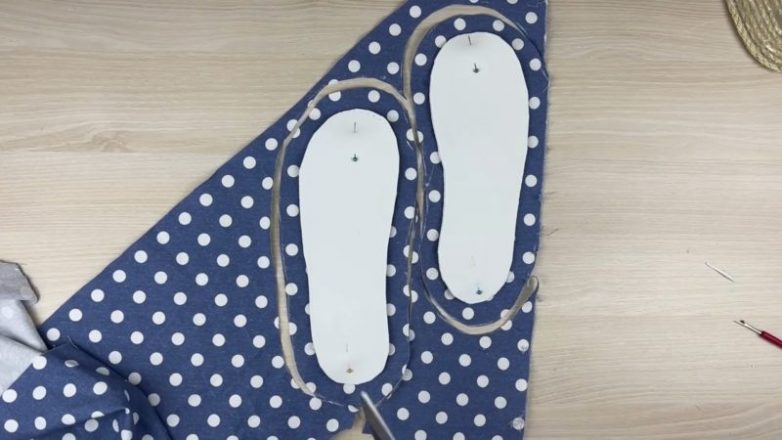 Из тонких тапочек отрежьте и уберите верхнюю часть, выровняв по форме подошвы. Вместо тонких тапочек можно использовать уже готовые стельки. Стельки приколите к тянущейся ткани, вырежьте с припуском 1-2 см. Надрежьте ткань по кругу и приклейте к стелькам.