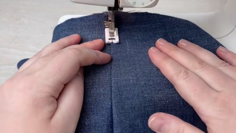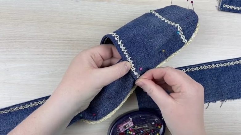 Также вырезаем 2 детали для задника тапочек из прямоугольника 7*30 см. Приколите к краю джинсов, чтобы получилась двойная спаянная деталь.