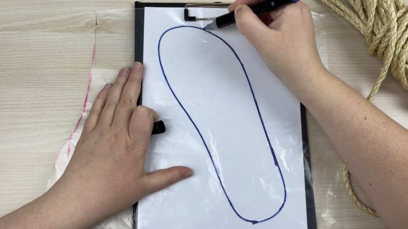 Теперь нам необходима выкройка верхней части. Для этого к ноге прикладываем бумагу и обводим фломастером контур.