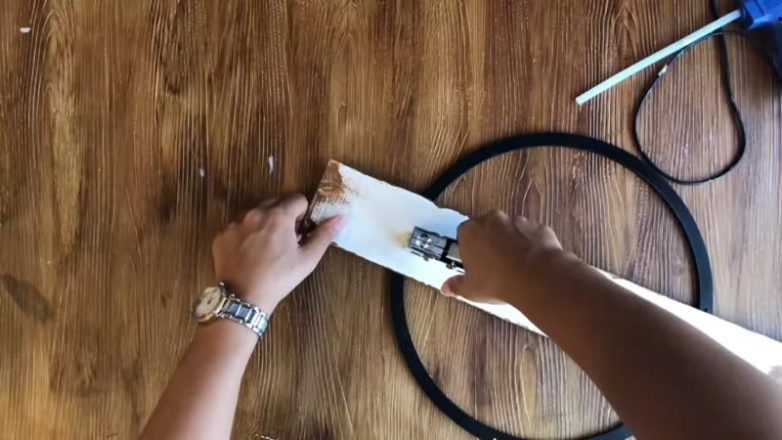 Найти идеальное место «по центру» кольца и прикрепить с помощью мебельного степлера доску в кольцу. Можно воспользоваться короткими саморезами.