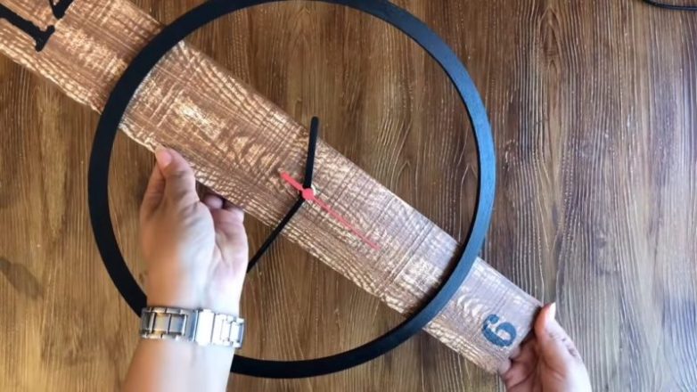 По центру доски сделать отверстие. Установить часовой механизм. Закрепить стрелки. Сзади приклеить уголок на прочный клей, чтобы можно было подвесить конструкцию.