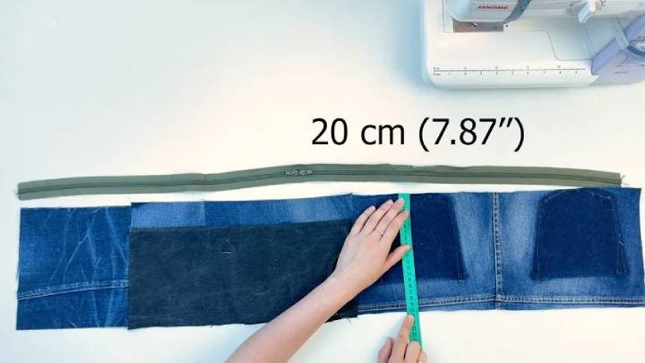Теперь из джинсовых кусочков соберите новый блок 103*20 см. Приложите молнию к краю с обратной стороны, поверх положите отрез любой ткани, также 103*20 см, прошейте на машинке по краю. К другой стороне молнии пришейте полоску из джинсов 103*4 см, тем самым увеличив блок до размеров 103*24 см. К этой полоске также с обратной стороны пришейте ткань для изнанки.