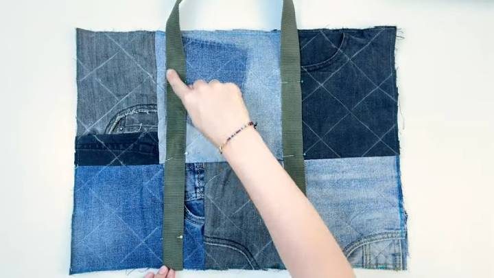 Теперь сделайте третий блок из кусочков джинсов — 64*24 см. Точно так же укрепите его с обратной стороны клеевой + тканью для изнаночной стороны. На лицевой стороне нарисуйте с помощью линейки и мыла такой же рисунок, прошейте. Теперь края двух блоков — 64*24 см и 103*24 см соедините. Прошейте края на машинке. Обработайте края, чтобы они аккуратно смотрелись, полосками ткани или лентой.