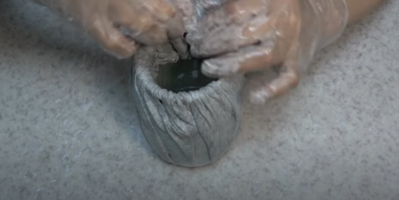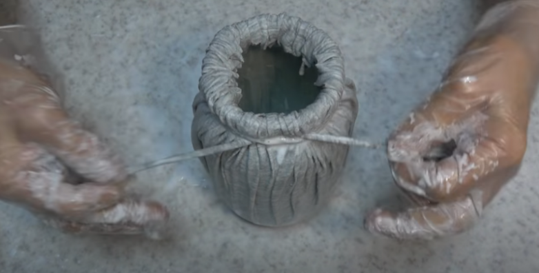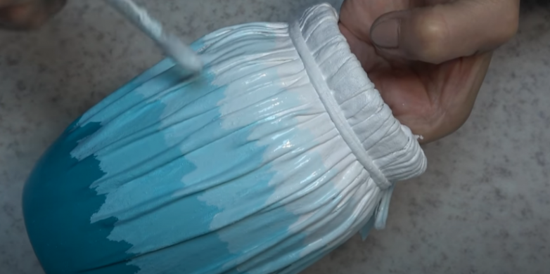 Далее оформляем банку пропитанной клеем тканью, хорошо драпируем ткань и оформляем складки.