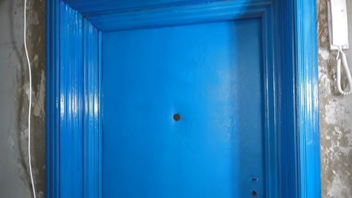 От предыдущего ремонта оставалось треть банки голубой краски ПФ-115. Ею было решено покрасить дверь и откосы.
