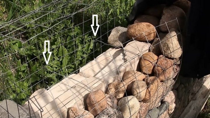 Чтобы короб не распёрло от наполняющих его камней, внутри толстой проволокой нужно сделать перемычки. Для этого на отрезке проволоки равном ширине габиона плюс 4-5 см с двух сторон нужно загнуть крючки. Устанавливать перемычки желательно где-то через каждые 20 см. Крючки нужно зацепить за противоположные стенки и зажать. После этого можно закладывать камни. Кстати, чтобы сэкономить, с невидимой стороны и в середину можно укладывать в габион кирпичи и большие камни, а вот с лица нужно постараться выложить поверхность ровно и красиво.