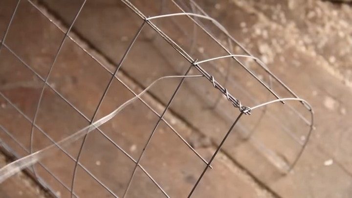 Если найти сетку полностью соответствующую вашей задумке не удалось, придётся поработать ножницами по металлу и выкроить необходимые детали. Скреплять стенки сетчатой заготовки оптимально вязальной проволокой: отрезав примерно 1,5 длины сегмента, нужно хорошо закрепить её конец и, делая минимум 3-4 «стежка» на ячейку, обмотать ею весь край.