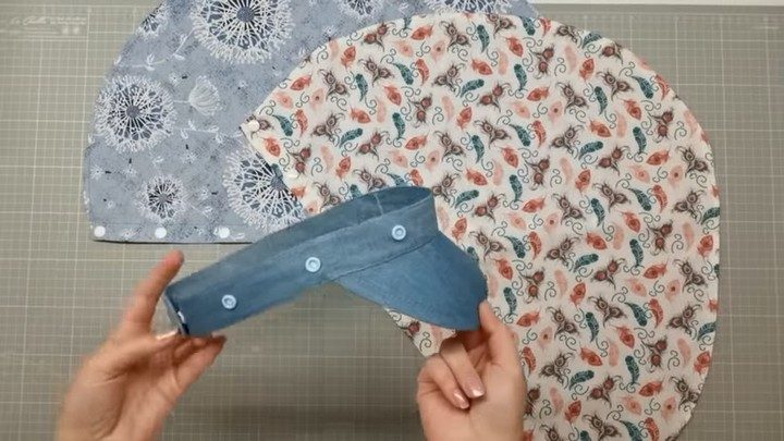 Вкладыш в козырёк можно сделать из кухонного коврика. Вырезать деталь нужно без каких либо припусков. Вкладывая его внутрь тканевой детали, постарайтесь разместить вкладыш так, чтобы припуски оказались на нижней части козырька. После этого нужно зафиксировать вкладыш внутри тканевой детали, проложив строчку на расстоянии 0,5-1 см от края. Перед этим внутренние срезы желательно совместить и сметать.