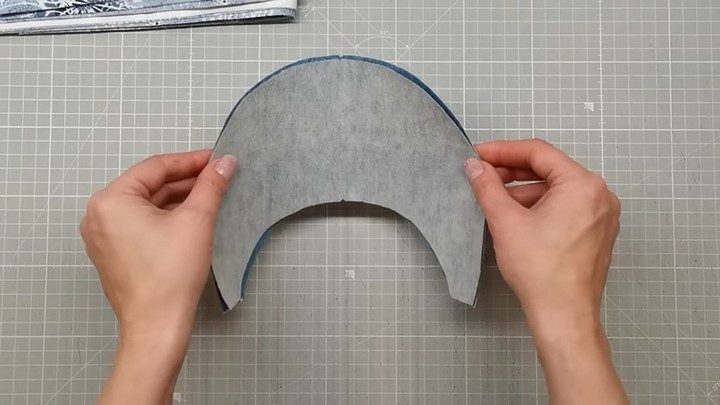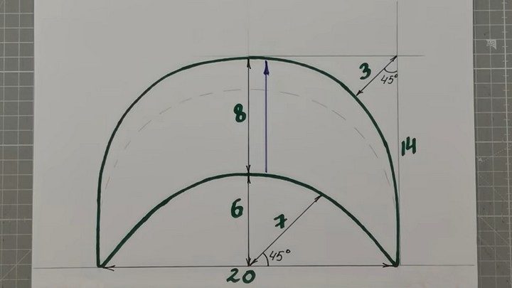 Выкраивая детали козырька, припуск по внутреннему изгибу нужно сделать около 1 см, а по внешнему — 0,75 см для верхней детали и 0,5 для нижней. Это делается для того, чтобы после совмещения срезов и стачивания (при этом нижняя деталь чуть натягивается) козырёк самопроизвольно согнулся. Стачав внешние срезы, припуск нужно подрезать ножницами зигзаг. После этого деталь вывернуть, все швы тщательно расправить и отутюжить с паром.