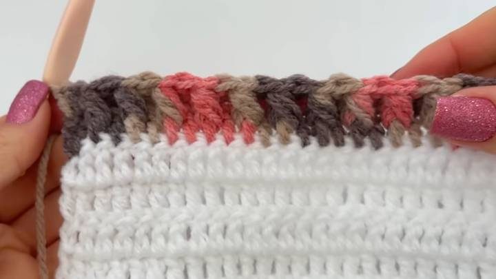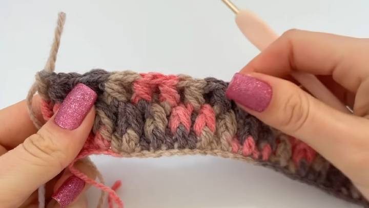 Далее будем вязать красивый узор. Для этого поднимаемся на 2 ВП, делаем накид. Крючок вставляем за первый столбик с накидом в первом провязанном ряду. Вытягиваем нить, делаем ещё один накид, снова вставляем крючок за тот же столбик, вытягиваем нить. Затем провязываем все петли на крючке. Запомните этот паттерн — он будет повторяться. Получится интересный, перекрученный, выпуклый узор. Далее необходимо провязать обычный СБН в следующую в третьем ряду петлю. Эти две петли будут чередоваться весь ряд: сначала заводите крючок за ССН в первом ряду (следующий по счёту), потом — вяжете обычный СБН в третьем ряду, и так до конца ряда. В конце можно закончить просто двумя ССН.
