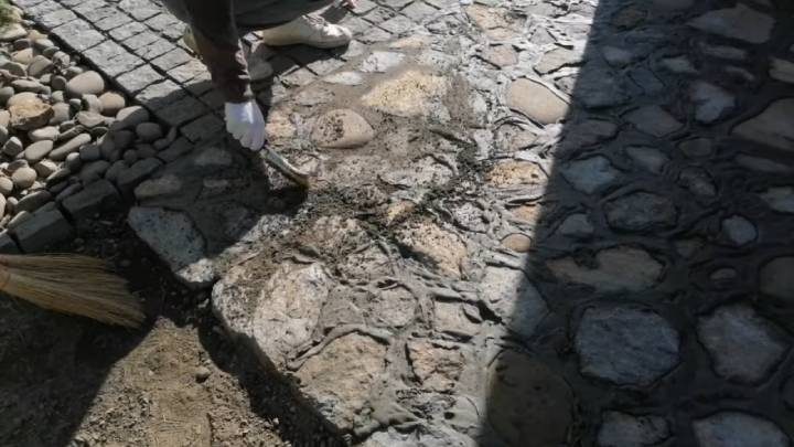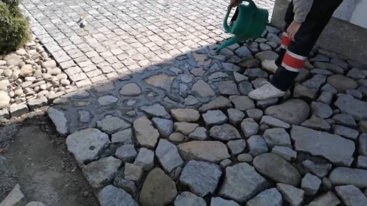 Сначала нужно выкопать землю на 1-2 штыка лопаты. В качестве подсыпки под камень используйте строительный мусор, щебень, мелкие остатки крупных камней. Рассыпав подсыпку на 10-15 см в высоту, сверху разложите камень на одном уровне. Швы залейте жидким цементным раствором из расчёта 1 часть цемента и 3 части песка. Оставьте до следующих суток.