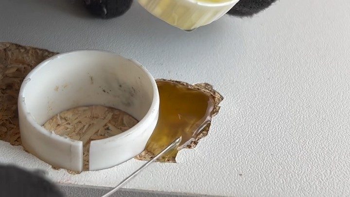 После 12-часовой просушки резервирующее кольцо извлекаем, а поверхность латок выравниваем шкуркой. Тщательно убираем всю пыль и наносим шпатлёвку для дерева.