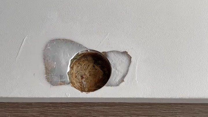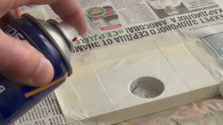 Первое, что необходимо сделать, это поставить в круглое углубление, где раньше была петля, что-то, что полностью зарезервирует эту выемку. Для этого, например, подойдёт кусок пластиковой трубы. Желательно, чтобы он возвышался над поверхностью, чтобы в последствии его было удобно извлечь.