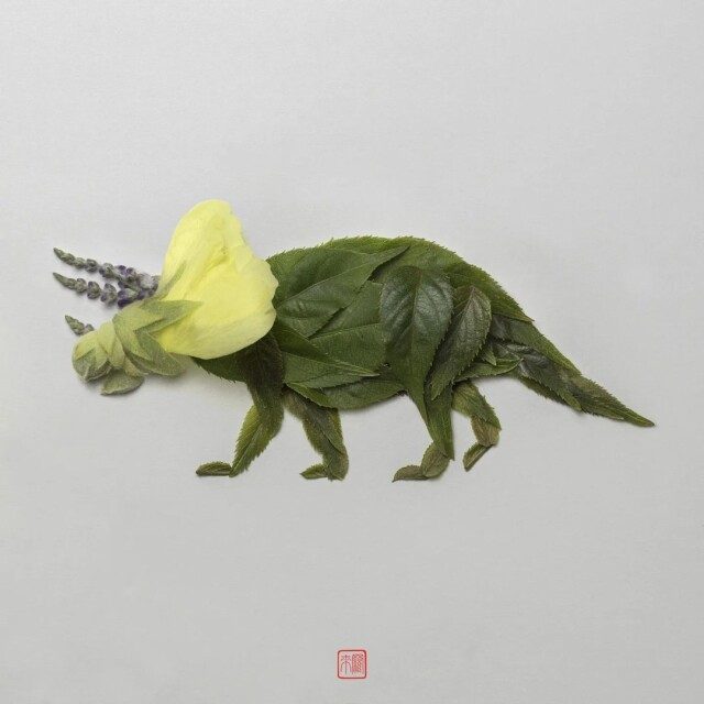 Художник Раку Иноуэ (Raku Inoue) создаёт очаровательные портреты динозавров, используя листья и цветы.