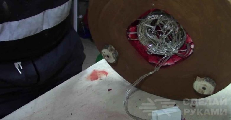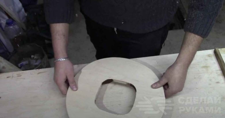 Основание самоделки можно сделать из мебельного щита или фанеры. Вырезаем лобзиком круг нужного диаметра. По центру заготовки надо вырезать квадратное отверстие под пластиковый лоток.