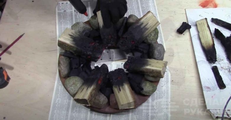 С помощью термоклея крепим к верхней части основания камушки и древесные угли. Потом приклеиваем дровишки.