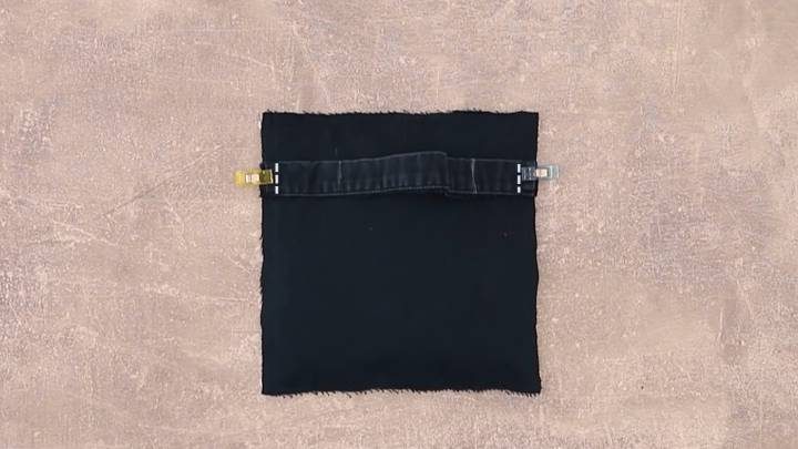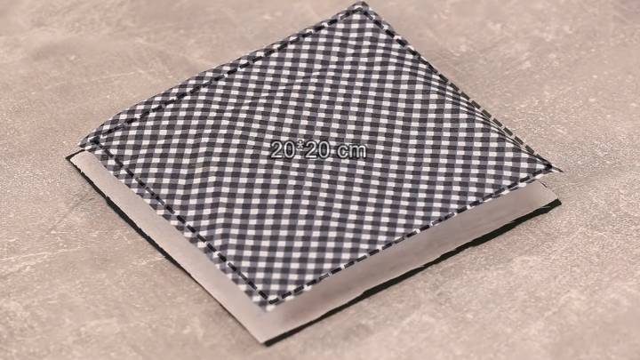 Отдельно из джинсовой ткани вырезать квадрат со сторонами 20 см. Сверху также положить клеевую, прогладить, затем — синтепон, в конце — красивую ткань для изнаночной стороны. Прошить по всем сторонам.