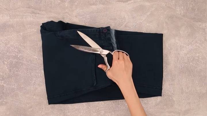 Отмерить 58 см от штанин, отрезать. Также обрезать фабричные швы.
