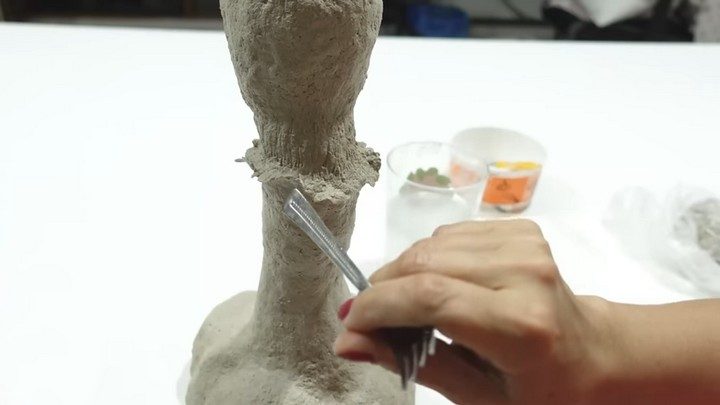 Далее, промазывая поверхность клеем ПВА, фрагмент за фрагментом покрываем заготовку ножки тестом из картона. Из него же создаём мелкие детали. Тесто будет лучше примазываться, если слегка смачивать пальцы водой. Фактуру на поверхности можно создать любыми подручными инструментами — например, вилкой. После того, как ножка гриба в общих чертах будет закончена, ей надо дать полностью высохнуть.