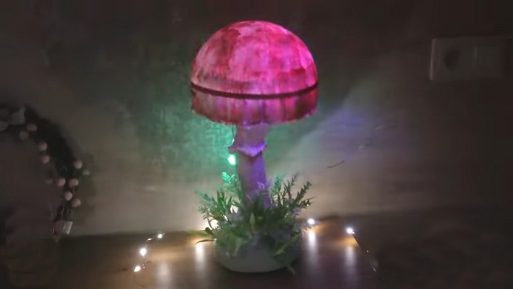 Внутрь чудо-гриба вкладываем электро-гирлянду и устанавливаем шляпку. Фантастический ночник готов! Впрочем, он очень интересно смотрится и при свете дня.