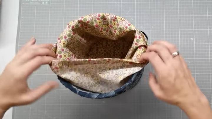 Обрежьте, выровняйте, на машинке пройдитесь ещё раз по краям. Для дна вырежьте картон, к которому приклейте ткань.