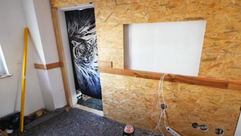 После этого вырезаем по размеру листы фанеры или OSB. Прикручиваем их к обрешетке. По центру стены оставляем нишу для телевизора.