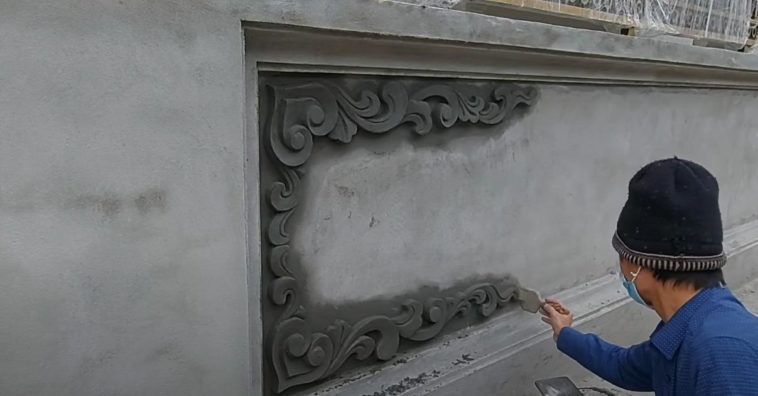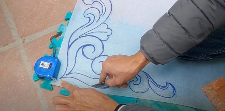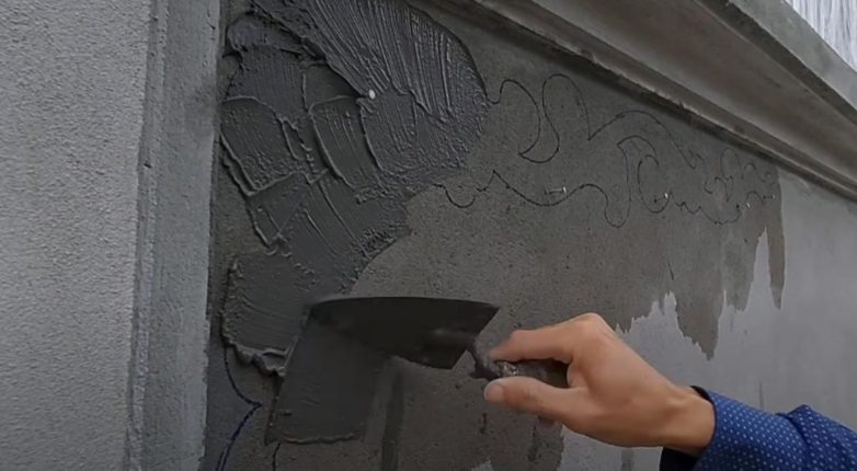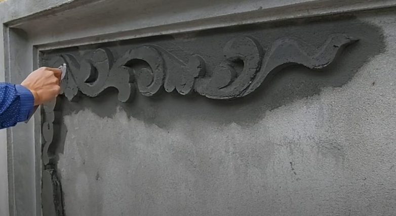 Теперь прикладываем трафарет и обрезаем лишние куски раствора, придавая ему нужную форму. Потом останется только довести орнамент до ума.