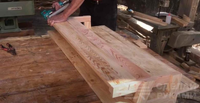 Сначала изготавливаем столешницу. Подготовленные доски склеиваем в щит требуемого размера.