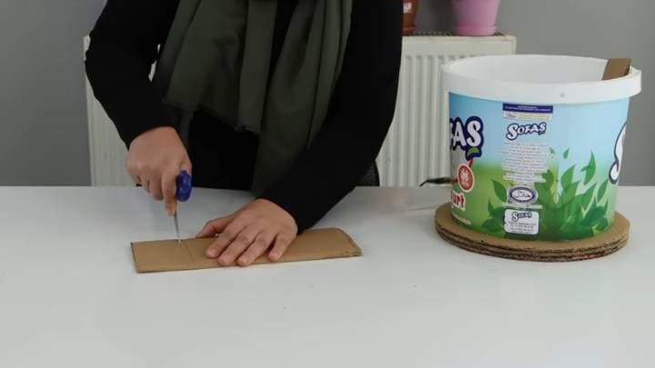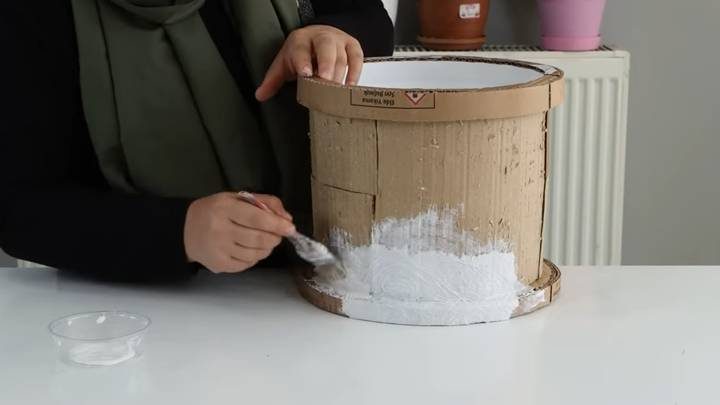 Ко дну приклеить круги из картона, склеенные между собой в 3 слоя. Также картоном оклеить всё ведёрко полностью. Сверху приклеить салфетки с помощью клея ПВА, немного разведённого водой.