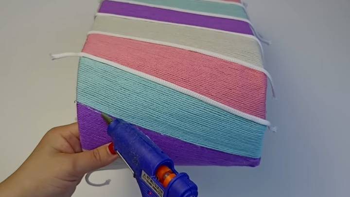 Под наклоном приклейте скотч с пряжей, чередуя цвета.
